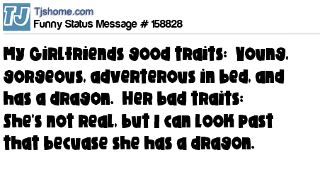 X says My Girlfriends good traits: Young, gorgeous, adverterous in bed, and has a dragon. Her bad traits: She's not real, but I can look past that becuase she has a dragon.