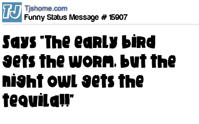 X is says "The early bird gets the worm, but the night owl gets the tequila!!"