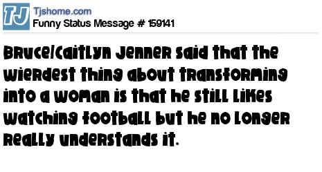 X Bruce/Caitlyn Jenner said that the wierdest thing about transforming into a woman is that he still likes watching football but he no longer really understands it.