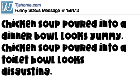 X says Chicken soup poured into a dinner bowl looks yummy. Chicken soup poured into a toilet bowl looks disgusting.