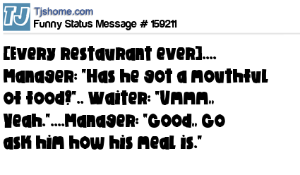 X [Every restaurant ever].... Manager: "Has he got a mouthful of food?".. Waiter: "Ummm,, Yeah."....Manager: "Good,, Go ask him how his meal is."