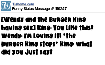 X says [Wendy and the Burger King having sex] King: You like this? Wendy: I'm loving it! *the Burger King stops* King: What did you just say?