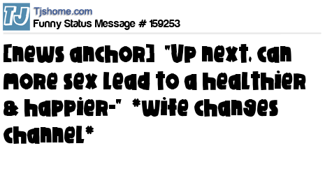 X says [news anchor] "Up next, can more sex lead to a healthier & happier-" *wife changes channel*