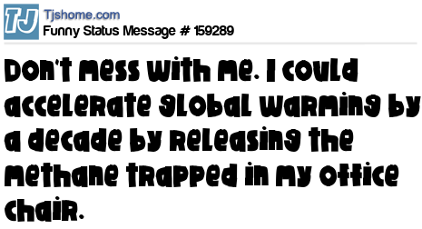 X Don't mess with me. I could accelerate global warming by a decade by releasing the methane trapped in my office chair.