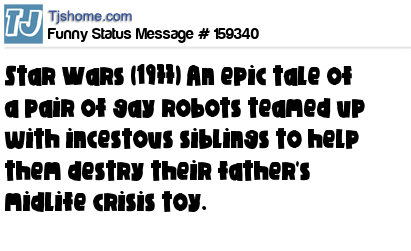 X says Star Wars (1977) An epic tale of a pair of gay robots teamed up with incestous siblings to help them destry their father's midlife crisis toy.