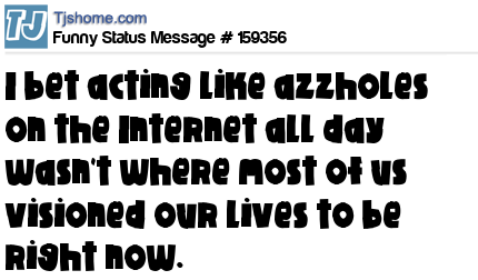 X says I bet acting like azzholes on the Internet all day wasn't where most of us visioned our lives to be right now.
