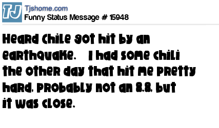 X heard Chile got hit by an earthquake. I had some chili the other day that hit me pretty hard, probably not an 8.8, but it was close.