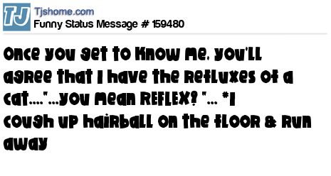 X Once you get to know me, you'll agree that I have the refluxes of a cat...."...you mean REFLEX? "... *I cough up hairball on the floor & run away