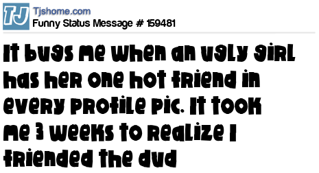 X says it bugs me when an ugly girl has her one hot friend in every profile pic. It took me 3 weeks to realize I friended the dud