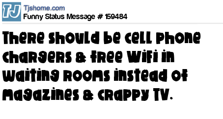 X says There should be cell phone chargers & free WiFi in waiting rooms instead of magazines & crappy TV.