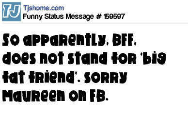 X says So apparently, BFF, does not stand for 'big fat friend'. sorry Maureen on FB.