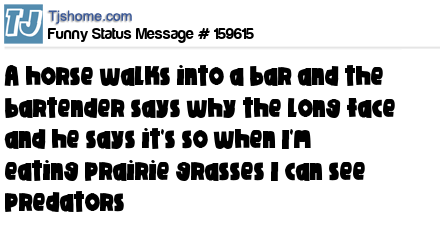 X says A horse walks into a bar and the bartender says why the long face and he says it's so when I'm eating prairie grasses I can see predators