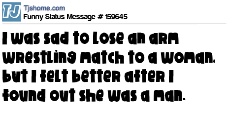 - # 105771 I was sad to lose an arm wrestling match to a woman, but I felt better after I found out she was a man. Then sad again because we had sex.
