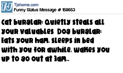 X says Cat burglar: Quietly steals all your valuables Dog burglar: Eats your ham, sleeps in bed with you for awhile, wakes you up to go out at 3am..