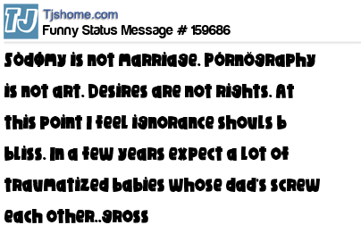 X says Sòdømy is not marriage. Pórnögraphy is not art. Desires are not rights. At this point I feel ignorance shouls b bliss. In a few years expect a lot of traumatized babies whose dad's screw each other..gross