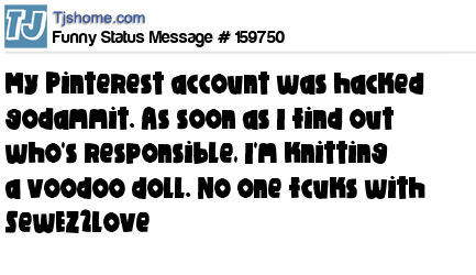 X says My Pinterest account was hacked godammit. As soon as I find out who's responsible, I'm knitting a voodoo doll. No one fcuks with SewEZ2love