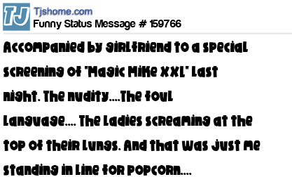 X Accompanied by girlfriend to a special screening of "Magic Mike XXL" last night. The nudity....The foul language.... The ladies screaming at the top of their lungs. And that was just me standing in line for popcorn....
