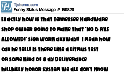 X Exactly how is that Tennessee Hardware shop owner going to make that "NO G AYS ALLOWED!" sign work anyway? I mean how can he tell? Is there like a litmus test or some kind of g ay Deliverance hillbilly honor system we all don't know about?
