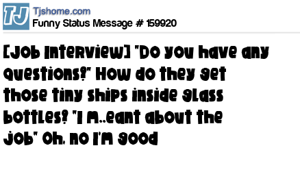 X says [Job Interview] "Do you have any questions?" How do they get those tiny ships inside glass bottles? "I m..eant about the job" Oh, no I'm good