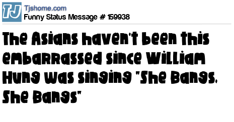 X says The Asians haven't been this embarrassed since William Hung was singing "She Bangs, She Bangs"