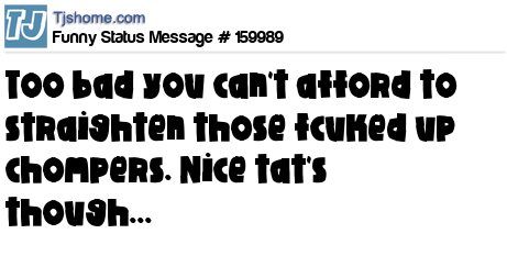 X Too bad you can't afford to straighten those fcuked up chompers. Nice tat's though...