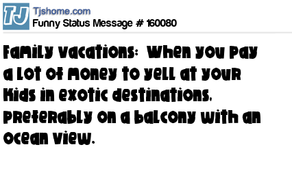X says Family vacations: When you pay a lot of money to yell at your kids in exotic destinations, preferably on a balcony with an ocean view.