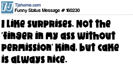 X says I like surprises. Not the 'finger in my ass without permission' kind, but cake is always nice.