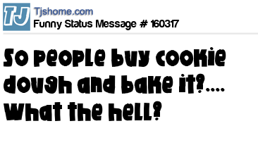 - # 168362 The FDA has announced that eating raw cookie dough is really bad for your health. So is telling my girlfriend not to eat raw cookie dough.