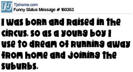 X says I was born and raised in the circus, so as a young boy I use to dream of running away from home and joining the suburbs.
