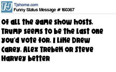 X says Of all the game show hosts, Trump seems to be the last one you'd vote for. I like Drew Carey, Alex Trebek or Steve Harvey better