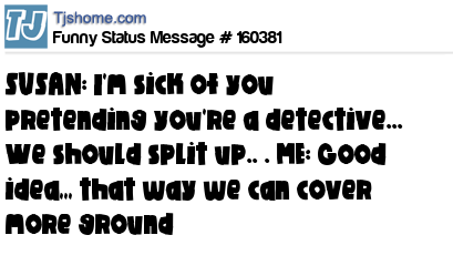 X SUSAN: I'm sick of you pretending you're a detective... We should split up.. . ME: Good idea,,, that way we can cover more ground