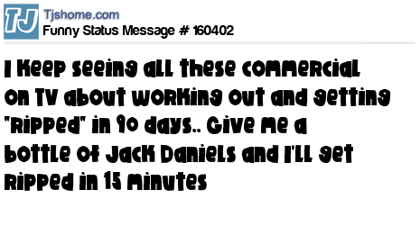 X says I keep seeing all these commercial on TV about working out and getting "ripped" in 90 days.. Give me a bottle of Jack Daniels and I'll get ripped in 15 minutes