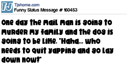 X says One day the mail man is going to murder my family and the dog is going to be like, "Haha... who needs to quit yapping and go lay down now?"