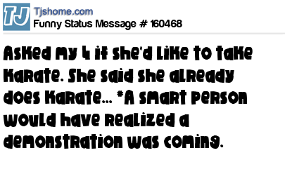 X Asked my 4 if she'd like to take karate. She said she already does karate... *A smart person would have realized a demonstration was coming.
