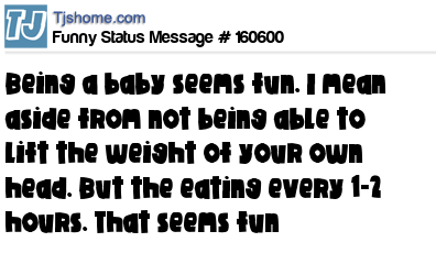 - # 166154 Being a baby would be fun. I mean aside from not being able to lift the weight of your own head. But the eating every 1-2 hours..THAT seems like fun.