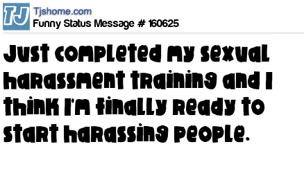X says Just completed my sexual harassment training and I think I'm finally ready to start harassing people.