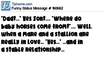 X "Dad?..." Yes Son?.... "Where do baby horses come from?".... Well, when a mare and a stallion are really in love… "Yes…" …and in a stable relationship…
