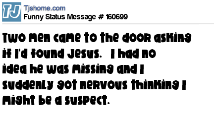 X says Two men came to the door asking if I'd found Jesus. I had no idea he was missing and I suddenly got nervous thinking I might be a suspect.