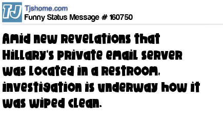 - # 160749 News just in: Hillary's private email server was located in a restroom. Clinton vows to get to the bottom of this.
