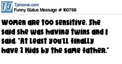 - # 136285 Girls are too sensitive. She said she was having twins and I said, "At least you'll finally have 2 kids by the same father."