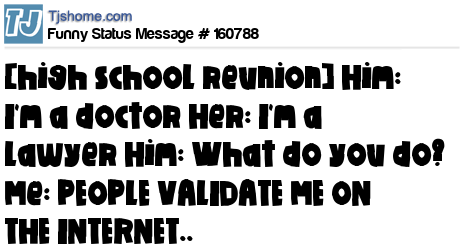 X says [high school reunion] Him: I'm a doctor Her: I'm a lawyer Him: What do you do? Me: PEOPLE VALIDATE ME ON THE INTERNET..