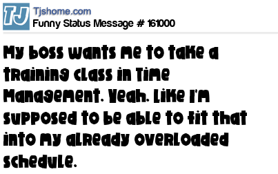 - # 180139 My boss wants me to go to Time Management training today. Yeah, like I'm really going to be able to squeeze that into my already overloaded schedule.