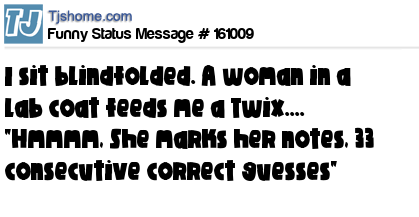X I sit blindfolded. A woman in a lab coat feeds me a Twix.... "Hmmmm, She marks her notes, 33 consecutive correct guesses"