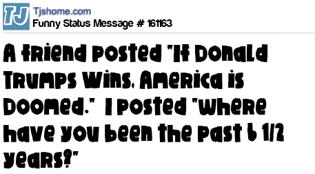 X A friend posted "If Donald Trumps Wins, America is Doomed." I posted "where have you been the past 6 1/2 years?"