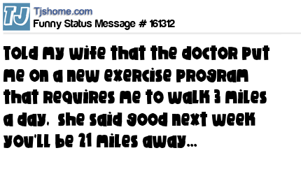 X says told my wife that the doctor put me on a new exercise program that requires me to walk 3 miles a day,  she said good next week you'll be 21 miles away...