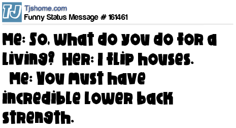 X says Me: So, what do you do for a living? Her: I flip houses. Me: You must have incredible lower back strength.