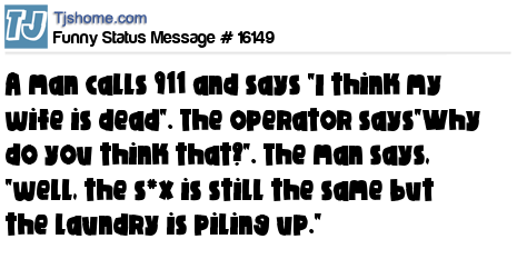 - # 84068 A man calls 911 and says "I think my wife is dead". The operator says, "How do you know?" He says "The sex is about the same, but the ironing is piling up!"