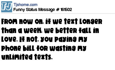 X From now on, if we text longer than a week, we better fall in love. If not, you paying my phone bill for wasting my unlimited texts.