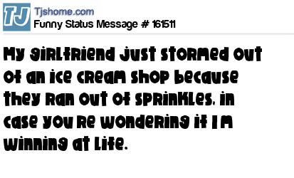X says My girlfriend just stormed out of an ice cream shop because they ran out of sprinkles, in case you’re wondering if I’m winning at life.