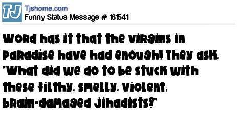 X says Word has it that the virgins in paradise have had enough! They ask, "What did we do to be stuck with these filthy, smelly, violent, brain-damaged jihadists?"